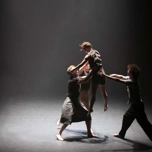 Partir du néant qui nous guette jusqu’à l’élan qui nous tente Printemps est le fruit de la collaboration entre Les Percussions Claviers de Lyon et la Compagnie La Vouivre, un concert chorégraphique, une suite de tableaux inspirés d’images symboliques sur le thème de la mort et de la renaissance, un voyage entre danse et percussion, à la fois funèbre et féerique. Dans une mise en scène aux airs d’incantation collective, quatre danseurs et cinq percussionnistes nous donnent à voir et à entendre un monde qui revient à la vie. Ensemble, ils célèbrent le Renouveau. Le temps d’une respiration collective, aux couleurs d’une fête macabre salvatrice, se dessine le paysage étrange d’une communauté qui choisit l’espoir comme ultime consolation. Ici, un squelette virevolte dans les airs ; là, des médecins de la peste cachés derrière d’inquiétants masques à bec manipulent le corps d’une danseuse du bout de leur longue baguette. La pièce propose différentes partitions poétiques, un espace de communion entre danse et musique qui, avec intensité et humour, révèle la vulnérabilité de la condition humaine.